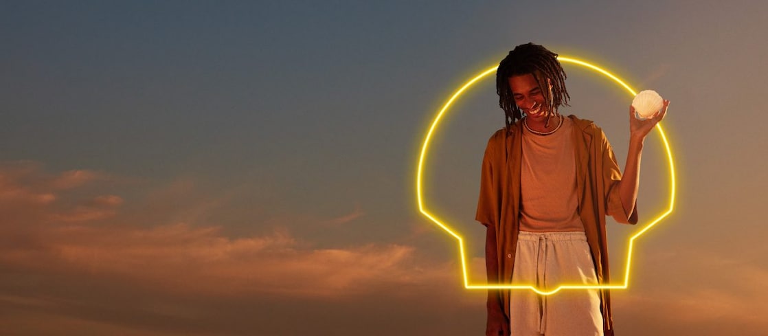 Corta para um homem negro de tranças, que segura uma concha nas mãos e olha para ela.