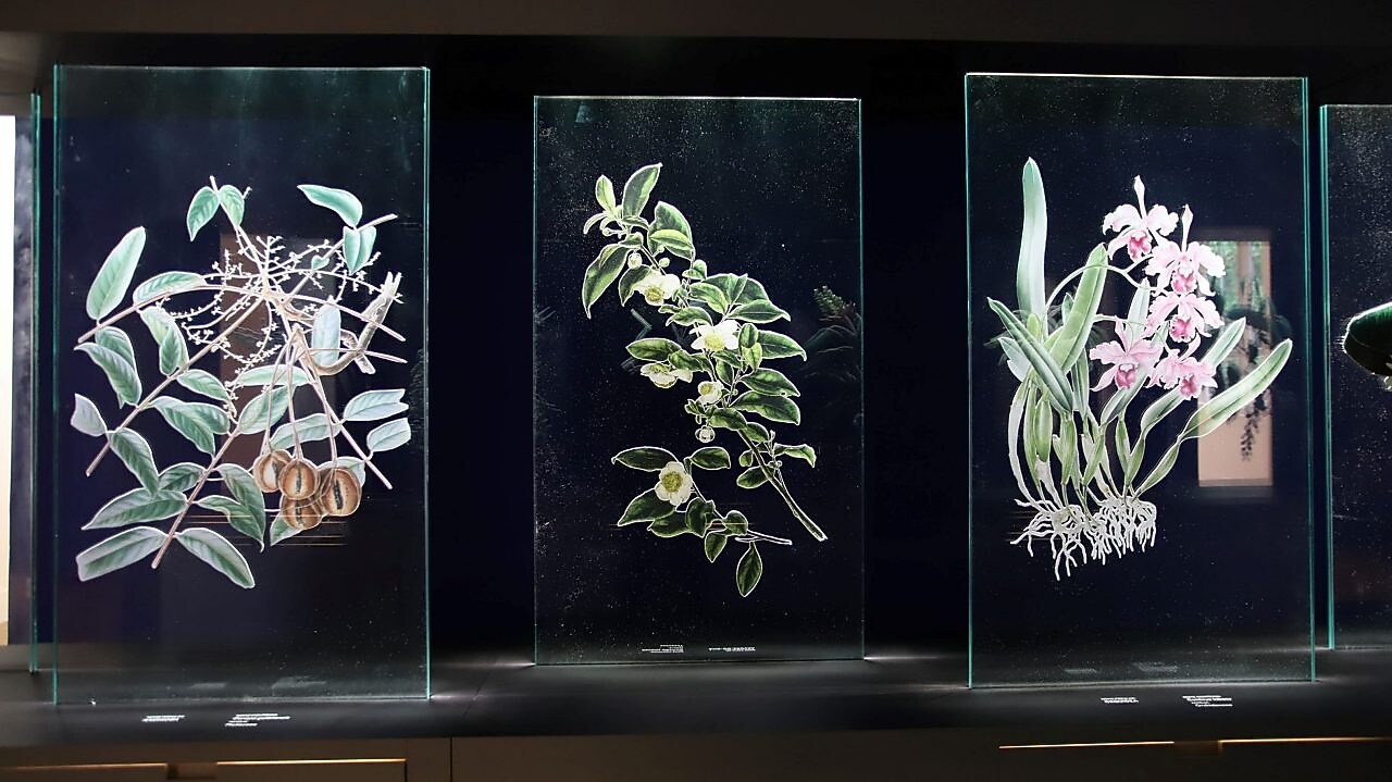 Corte para travelling da esquerda para direita mostrando o painel “Flora 2020 – Conhecendo a diversidade de plantas no Brasil”, que mostra diversas espécies da flora brasileira.